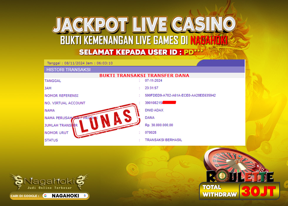 Selamat kepada User ID : PD*** Telah berhasil mendapatkan kemenangan besar pada permainan LIVE GAMES ROULETTE kemenangan Sebesar Rp.30.000.000, Setelah mengisi formulir withdraw dengan kurung waktu hanya 5 – 10 menit pihak Nagahoki sudah melakukan transfer kepada pemilik Userid dan dana sudah dapat di cairkan oleh pemenang. Bukti pembayaran yang kami berikan merupakan bukti pembayaran yang SAH / VALID yang langung di dapatkan melaui tanda transfer transaksi dari Bank yang di tuju.