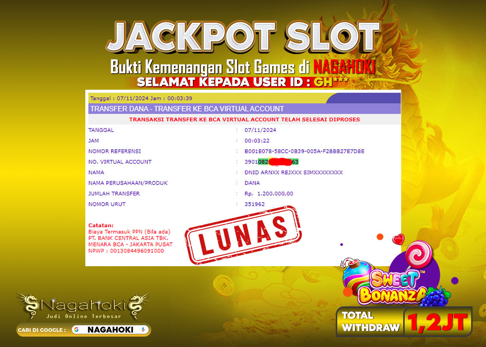 Selamat kepada User ID : GH*** Telah berhasil mendapatkan kemenangan besar pada permainan slot Sweet Bonanza kemenangan Sebesar Rp.1.200.000, Setelah mengisi formulir withdraw dengan kurung waktu hanya 5 – 10 menit pihak Nagahoki sudah melakukan transfer kepada pemilik Userid dan dana sudah dapat di cairkan oleh pemenang. Bukti pembayaran yang kami berikan merupakan bukti pembayaran yang SAH / VALID yang langung di dapatkan melaui tanda transfer transaksi dari Bank yang di tuju.