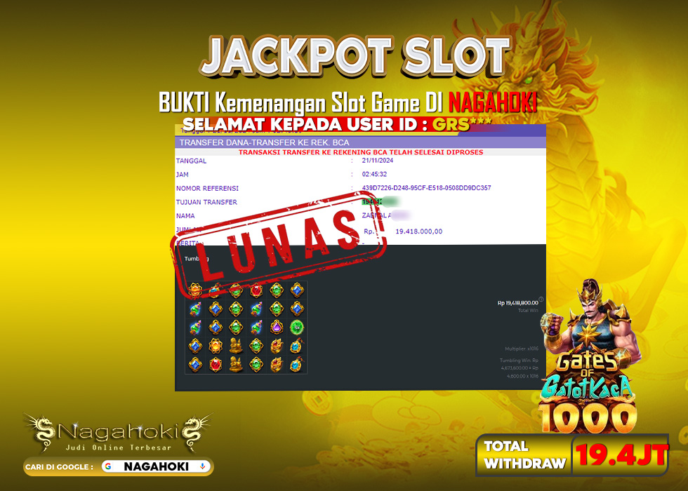 Selamat kepada User ID : GRS*** Telah berhasil mendapatkan kemenangan besar pada permainan SLOT GAMES Gates Of Gatotkaca 1000 kemenangan Sebesar Rp.19.418.000,- Setelah mengisi formulir withdraw dengan kurung waktu hanya 2 – 5 menit pihak Nagahoki sudah melakukan transfer kepada pemilik Userid dan dana sudah dapat di cairkan oleh pemenang. Bukti pembayaran yang kami berikan merupakan bukti pembayaran yang SAH / VALID yang langung di dapatkan melaui tanda transfer transaksi dari Bank yang di tuju.