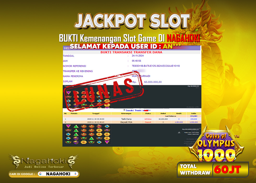 Selamat kepada User ID : AN *** Telah berhasil mendapatkan kemenangan besar pada permainan SLOT GAMES Gates Of Olympus 1000 kemenangan Sebesar Rp.60.000.000,- Setelah mengisi formulir withdraw dengan kurung waktu hanya 2 – 5 menit pihak Nagahoki sudah melakukan transfer kepada pemilik Userid dan dana sudah dapat di cairkan oleh pemenang. Bukti pembayaran yang kami berikan merupakan bukti pembayaran yang SAH / VALID yang langung di dapatkan melaui tanda transfer transaksi dari Bank yang di tuju.