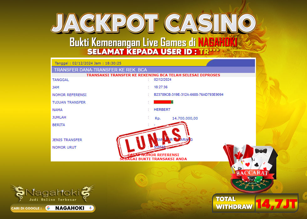 Selamat kepada User ID : HER*** Telah berhasil mendapatkan kemenangan besar pada permainan LIVE CASINO BACCARAT kemenangan Sebesar Rp.14.700.000,- Setelah mengisi formulir withdraw dengan kurung waktu hanya 2 – 5 menit pihak Nagahoki sudah melakukan transfer kepada pemilik Userid dan dana sudah dapat di cairkan oleh pemenang. Bukti pembayaran yang kami berikan merupakan bukti pembayaran yang SAH / VALID yang langung di dapatkan melaui tanda transfer transaksi dari Bank yang dituju.