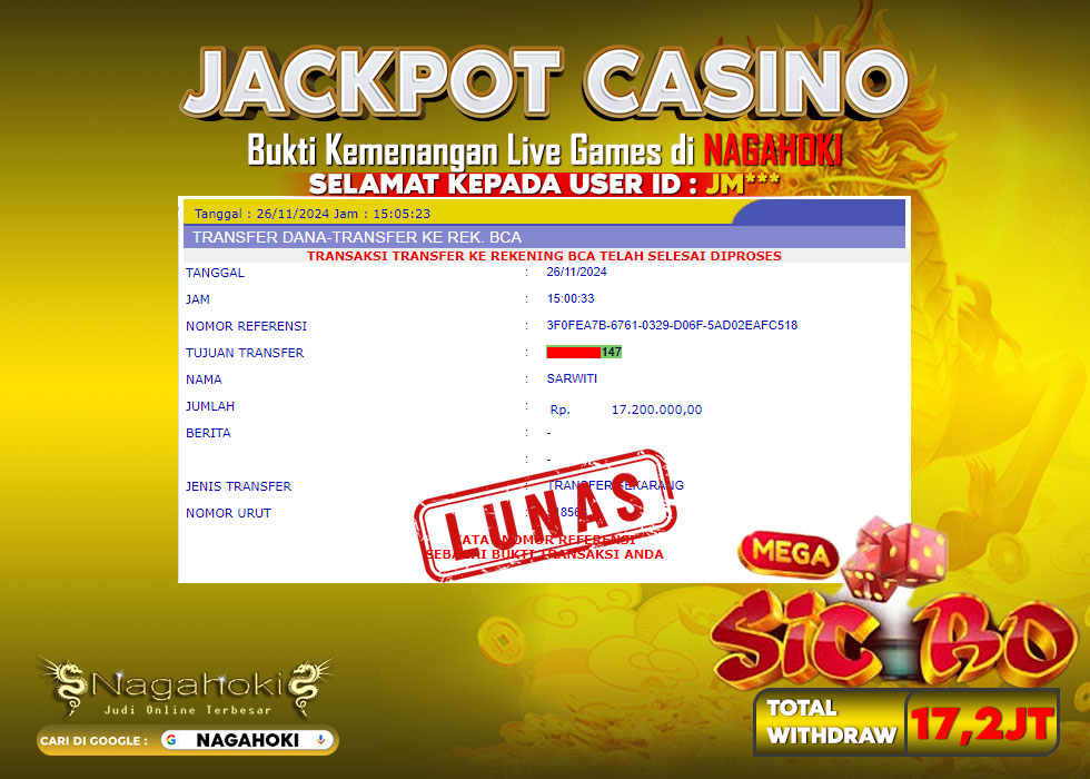 Selamat kepada User ID : SAR*** Telah berhasil mendapatkan kemenangan besar pada permainan LIVE CASINO SICBO kemenangan Sebesar Rp.17.200.000,- Setelah mengisi formulir withdraw dengan kurung waktu hanya 2 – 5 menit pihak Nagahoki sudah melakukan transfer kepada pemilik Userid dan dana sudah dapat di cairkan oleh pemenang. Bukti pembayaran yang kami berikan merupakan bukti pembayaran yang SAH / VALID yang langung di dapatkan melaui tanda transfer transaksi dari Bank yang dituju.