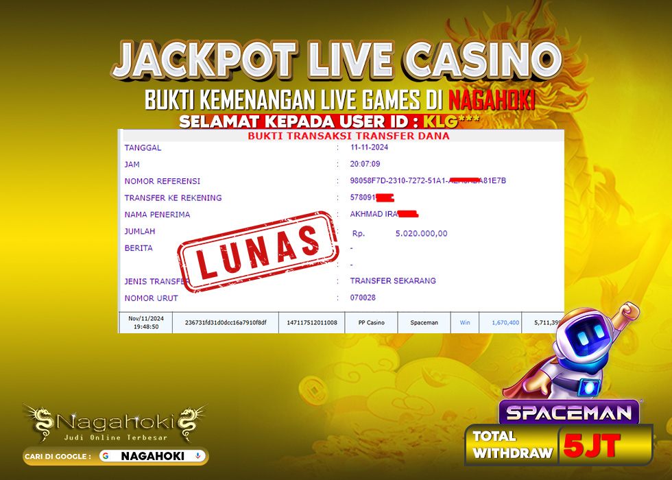 Selamat kepada User ID : KLG*** Telah berhasil mendapatkan kemenangan besar pada permainan LIVE GAMES SPACEMAN kemenangan Sebesar Rp.5.020.000, Setelah mengisi formulir withdraw dengan kurung waktu hanya 5 – 10 menit pihak Nagahoki sudah melakukan transfer kepada pemilik Userid dan dana sudah dapat di cairkan oleh pemenang. Bukti pembayaran yang kami berikan merupakan bukti pembayaran yang SAH / VALID yang langung di dapatkan melaui tanda transfer transaksi dari Bank yang di tuju.