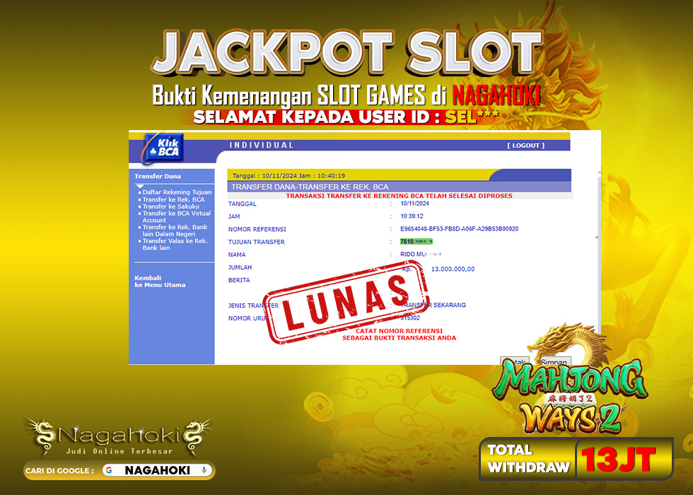 Selamat kepada User ID : SEL*** Telah berhasil mendapatkan kemenangan besar pada permainan MAHYONG WAYS 2 kemenangan Sebesar Rp.13.000.000, Setelah mengisi formulir withdraw dengan kurung waktu hanya 2 – 5 menit pihak Nagahoki sudah melakukan transfer kepada pemilik Userid dan dana sudah dapat di cairkan oleh pemenang. Bukti pembayaran yang kami berikan merupakan bukti pembayaran yang SAH / VALID yang langung di dapatkan melaui tanda transfer transaksi dari Bank yang di tuju.