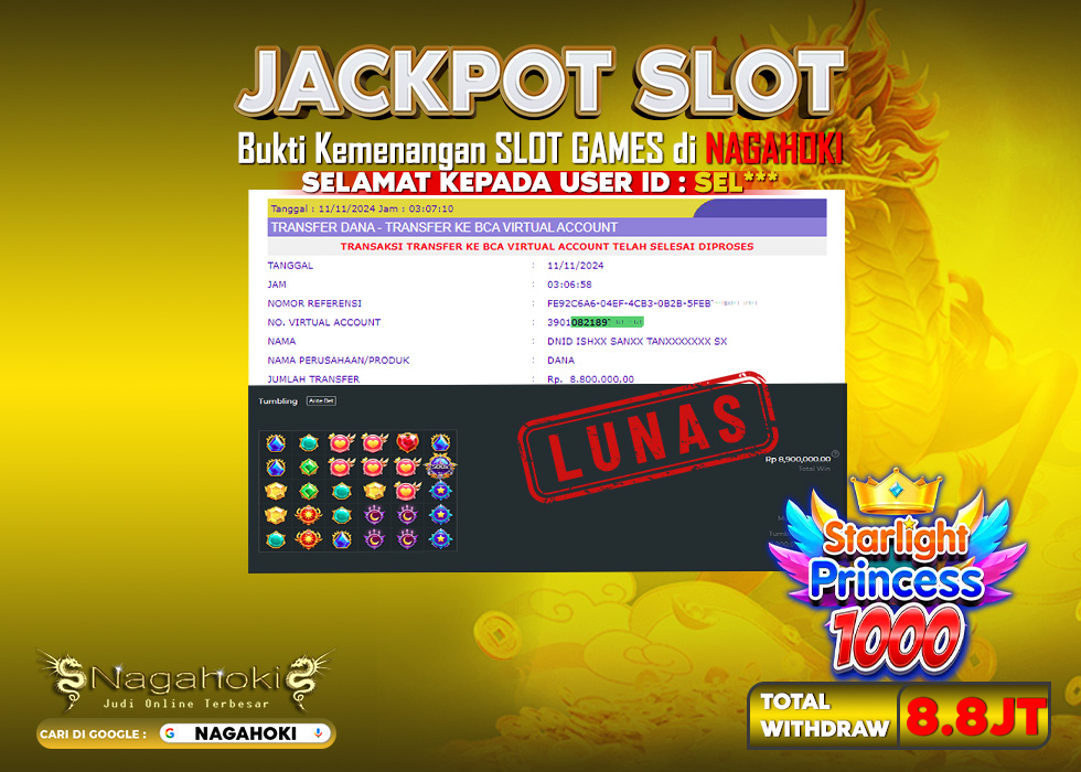 Selamat kepada User ID : SEL*** Telah berhasil mendapatkan kemenangan besar pada permainan slot Starlight Princes 1000 kemenangan Sebesar Rp.8.800.000, Setelah mengisi formulir withdraw dengan kurung waktu hanya 5 – 10 menit pihak Nagahoki sudah melakukan transfer kepada pemilik Userid dan dana sudah dapat di cairkan oleh pemenang. Bukti pembayaran yang kami berikan merupakan bukti pembayaran yang SAH / VALID yang langung di dapatkan melaui tanda transfer transaksi dari Bank yang di tuju.