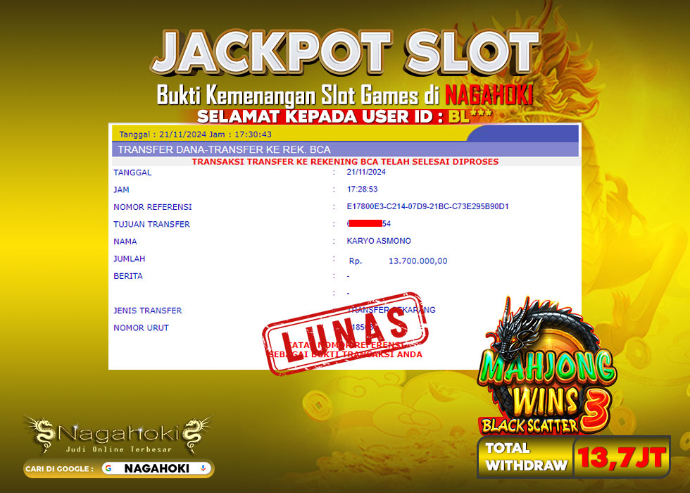 Selamat kepada User ID : KAR*** Telah berhasil mendapatkan kemenangan besar pada permainan SLOT GAMES MAHYONG WINS 3 Kemenangan Sebesar Rp.13.700.000,- Setelah mengisi formulir withdraw dengan kurung waktu hanya 2 – 5 menit pihak Nagahoki sudah melakukan transfer kepada pemilik Userid dan dana sudah dapat di cairkan oleh pemenang. Bukti pembayaran yang kami berikan merupakan bukti pembayaran yang SAH / VALID yang langung di dapatkan melaui tanda transfer transaksi dari Bank yang di tuju.