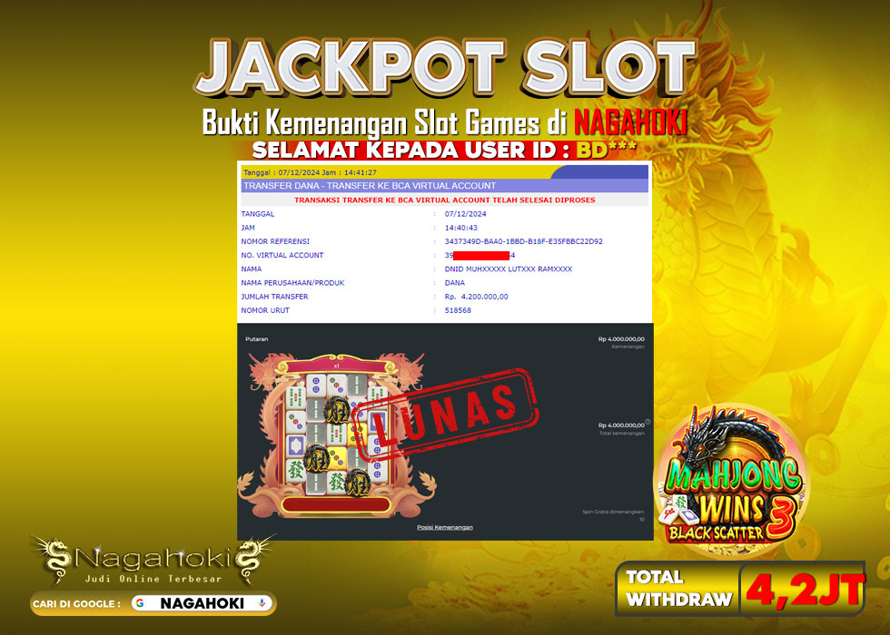 Selamat kepada User ID : MUH*** Telah berhasil mendapatkan kemenangan besar pada permainan SLOT GAMES MAHYONG WINS 3 SCATTER HITAM Kemenangan Sebesar Rp.4.200.000,- Setelah mengisi formulir withdraw dengan kurung waktu hanya 2 – 5 menit pihak Nagahoki sudah melakukan transfer kepada pemilik Userid dan dana sudah dapat di cairkan oleh pemenang. Bukti pembayaran yang kami berikan merupakan bukti pembayaran yang SAH / VALID yang langung di dapatkan melaui tanda transfer transaksi dari Bank yang di tuju.